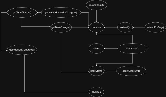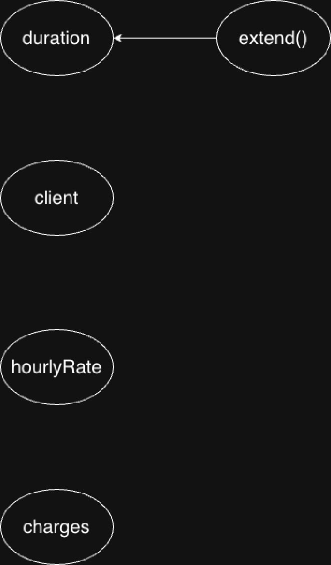 Veja que o método Booking#extend() modifica a variável duration. Então traçamos uma reta do método até a variável. Podem ignorar construtores nesta etapa.