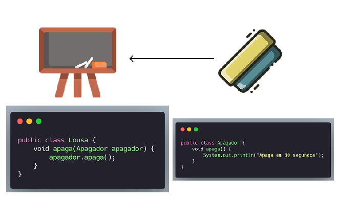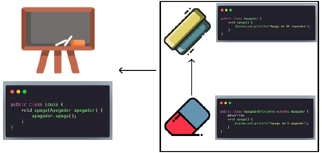 Em vez de alterar a classe Apagador, a equipe faz uma herança da classe Apagador para que a lousa consiga usar o Apagador e o Apagador Eficiente: